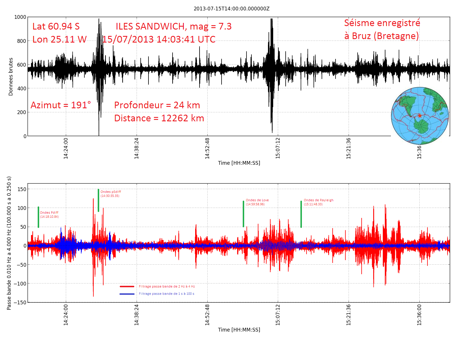 Mes courbes avec double filtrage de 1 s à 100 s (courbe bleue) et de 2 Hz à 4 Hz (courbe rouge).