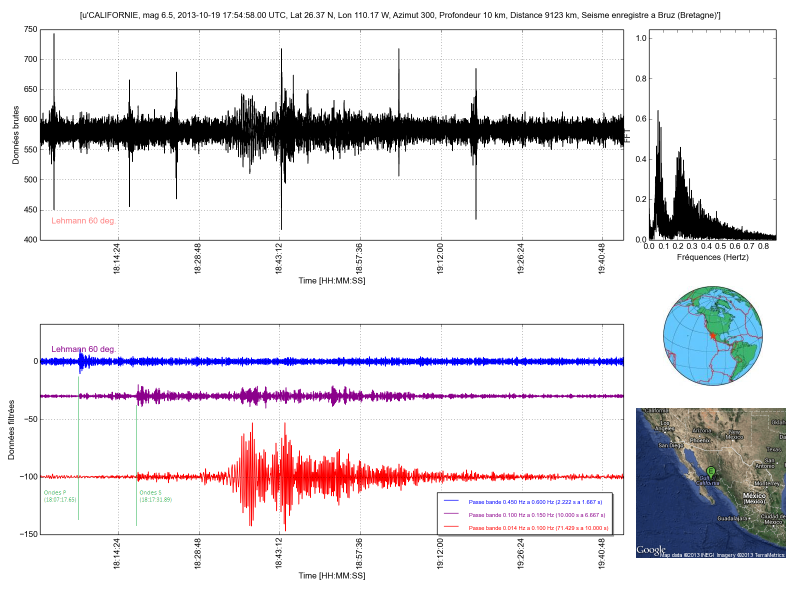 courbe bleue (Ondes P), courbe violette (Ondes S) et courbe rouge (Ondes de surface)