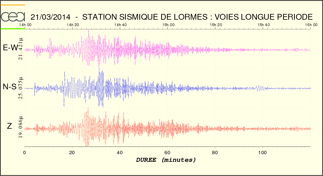 Les ondes P et S sont très faibles. Les ondes de surface sont par contre bien marquées