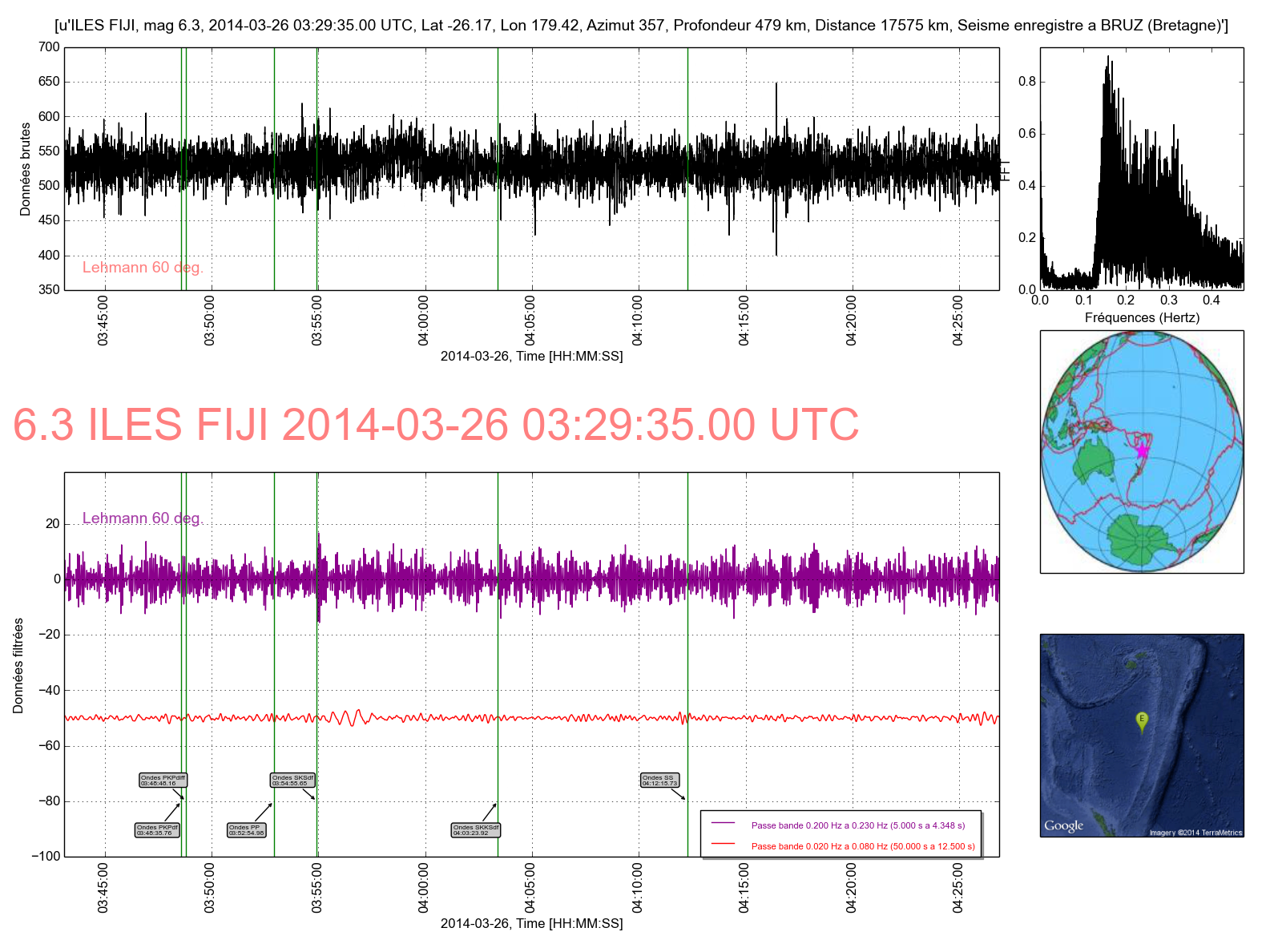 courbe violette (ondes S et dérivées) et courbe rouge ( ondes de surface).