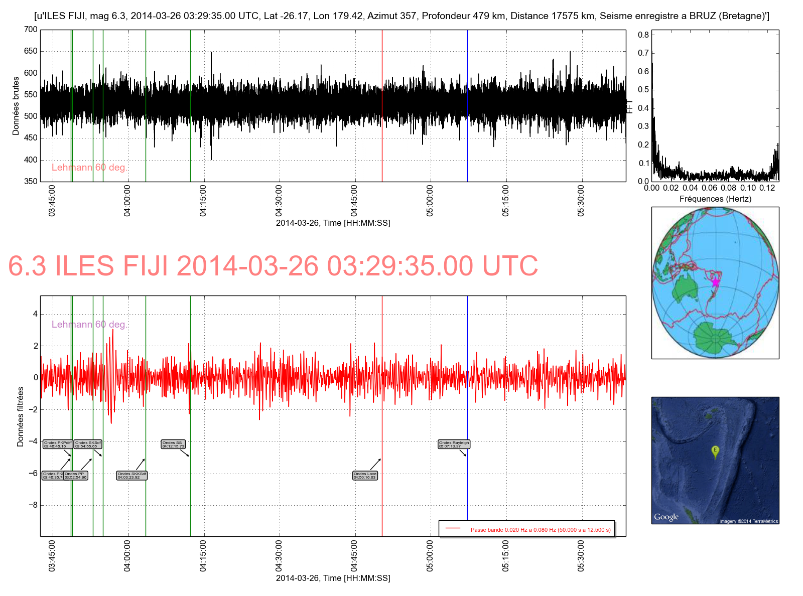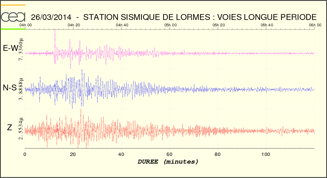 Les ondes P sont inexistantes et les onde de surface sont très faibles. Les ondes S ne sont pas plus importantes mais bien présentes à l'heure prévue