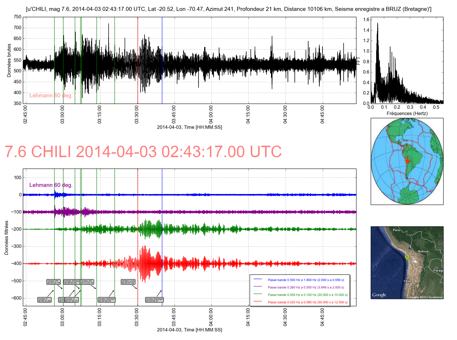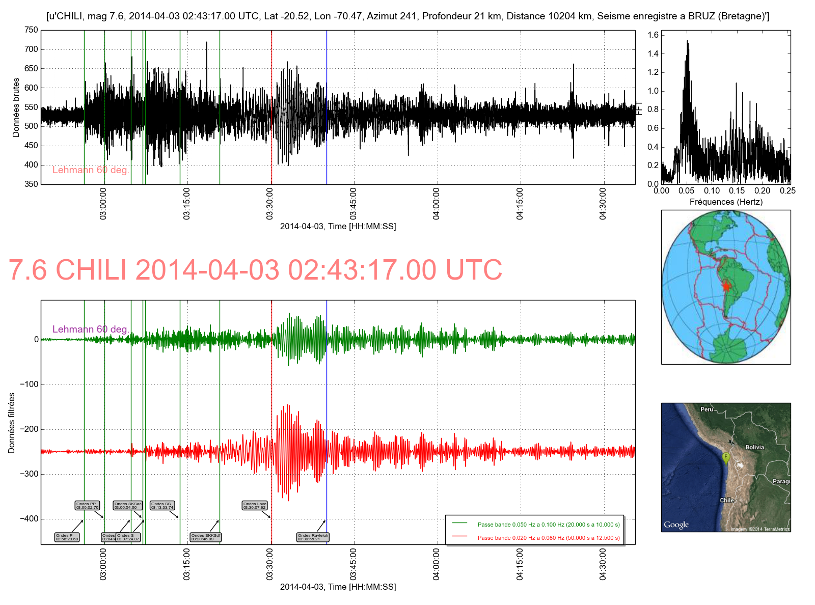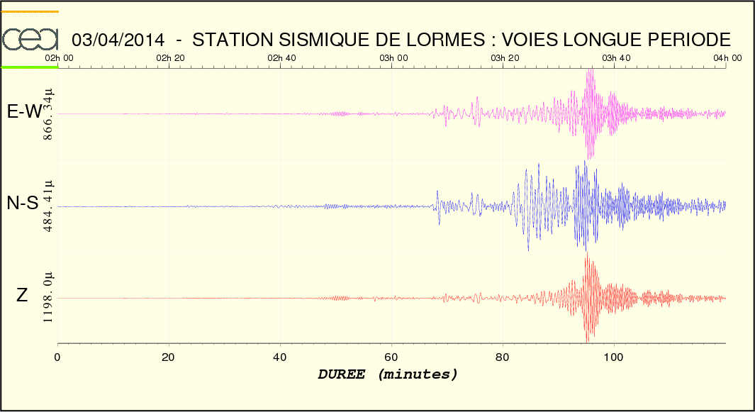 Courbe 3: Ondes S et de surface dans les gammes de fréquence 20s à 10s et 50s à 12.5s