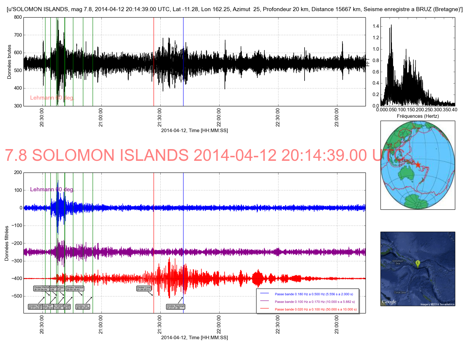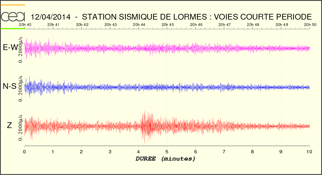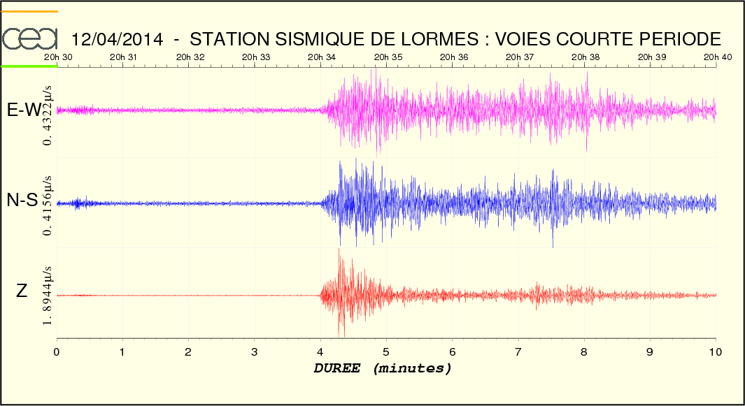 Courbe bleue et violette (Ondes P ), courbe rouge (Ondes S et surface). Les ondes P sont très importantes ainsi que les ondes de surface.