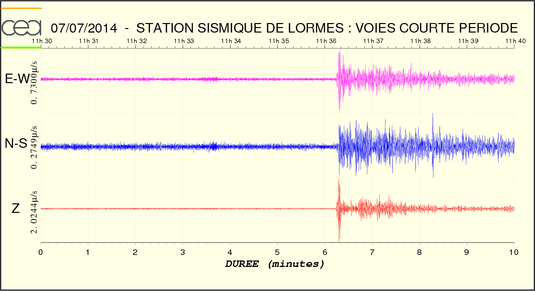 Les ondes P sont très faibles. Par contre de très grandes amplitudes pour les ondes S. Les ondes de Surfaces sont présentes elles aussi.