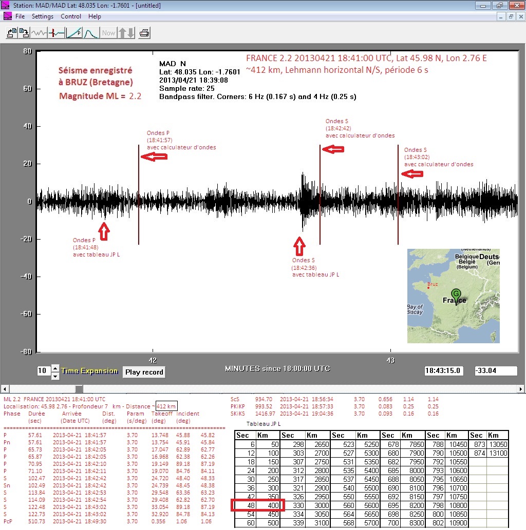 Heure arrivée onde P : 18:41:00 UTC + 48 s = 18:41:48 UTC