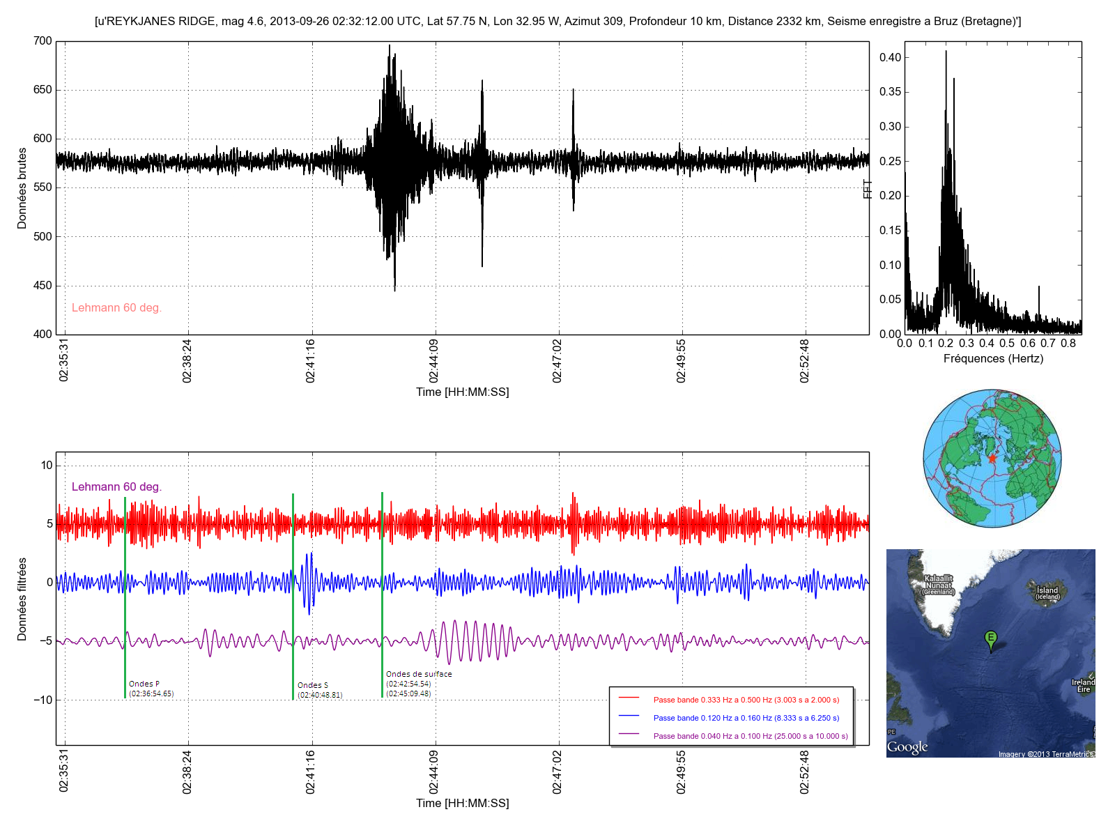 Ma courbe, courbe rouge (ondes P), courbe bleue (ondes S), courbe violette (Ondes de surface).