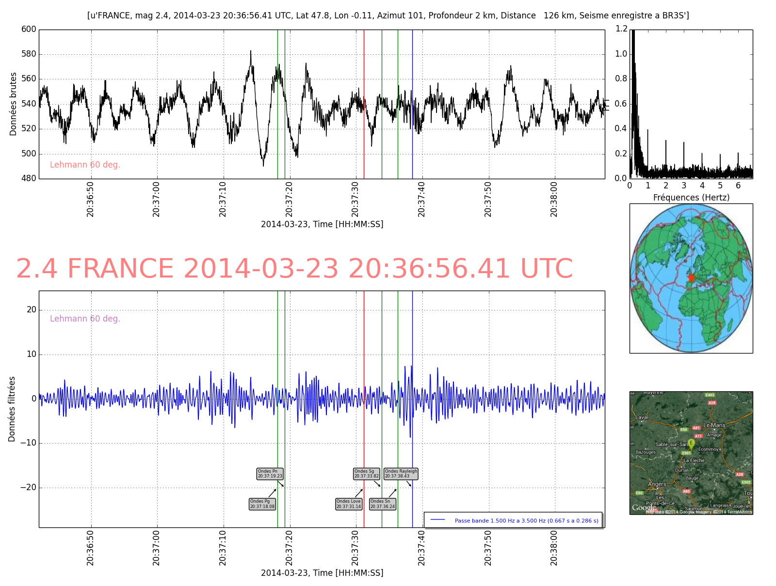 Ma courbe à la limite de la détection mais les repères automatiques des temps d'arrivée des ondes aident bien pour confirmer la réception du séisme.