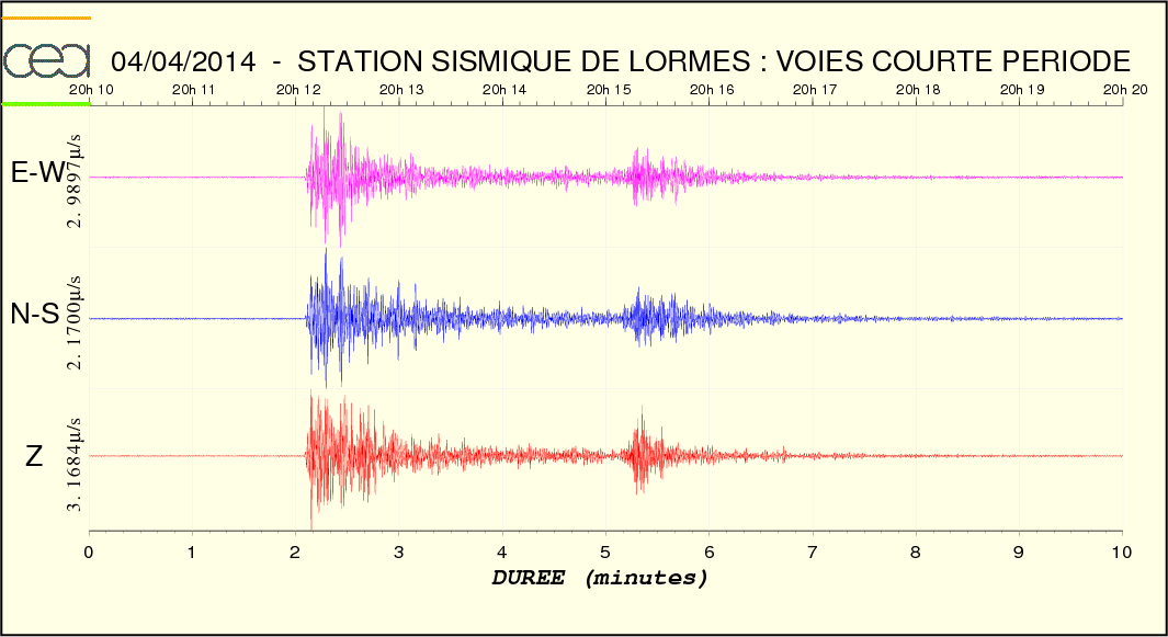 Courbe bleue (Ondes P ), courbe rouge (Ondes S). Les ondes de surface sont inexistantes.