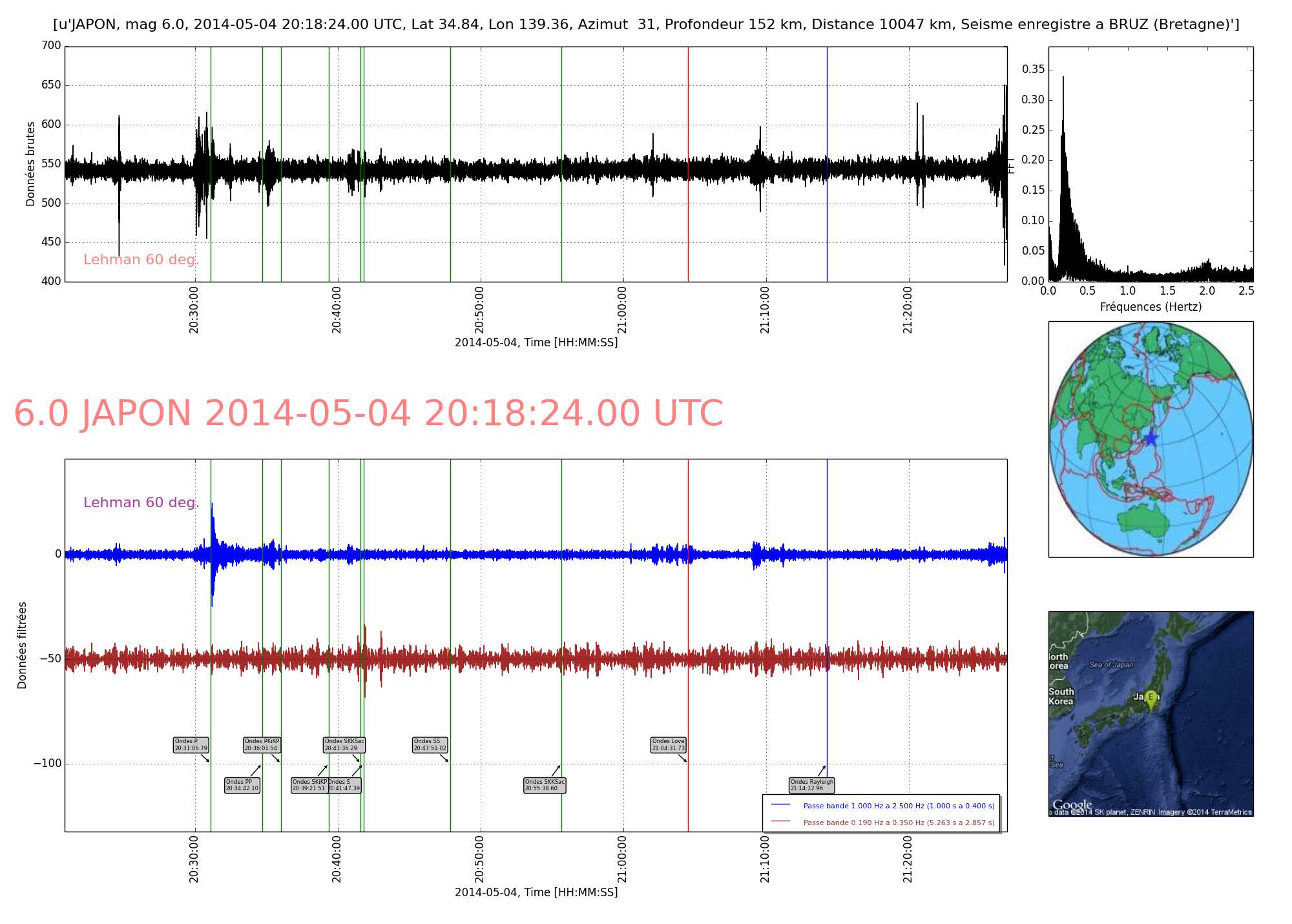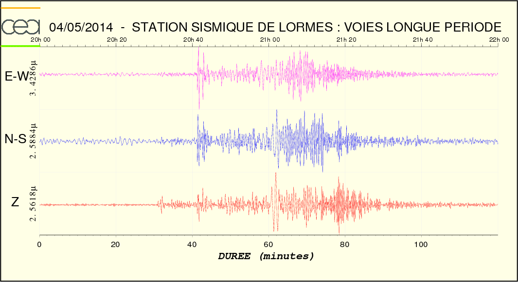 Courbe bleue (Ondes P ), courbe violette (S). Pas d'onde de surface