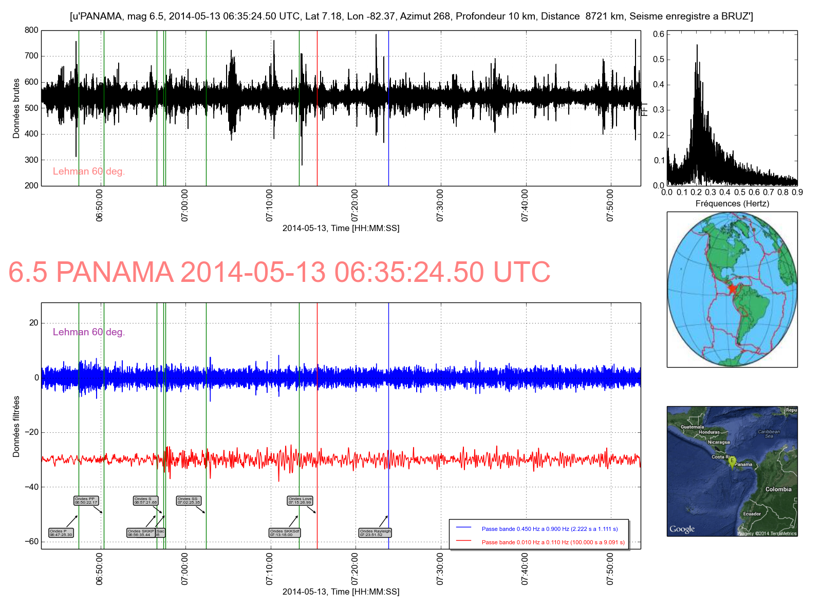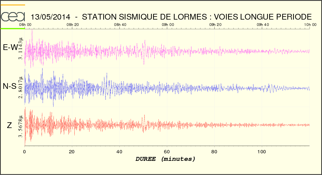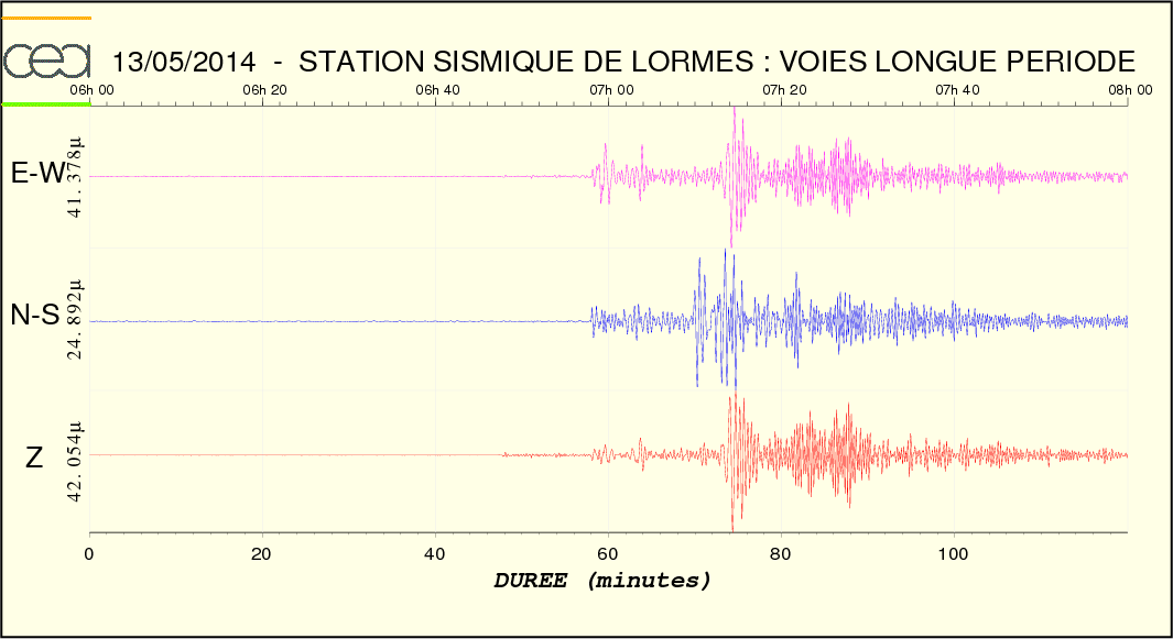 Courbe bleue (Ondes P ), courbe rouge (Ondes S et de surface). Les ondes P sont faibles ainsi que les ondes S.