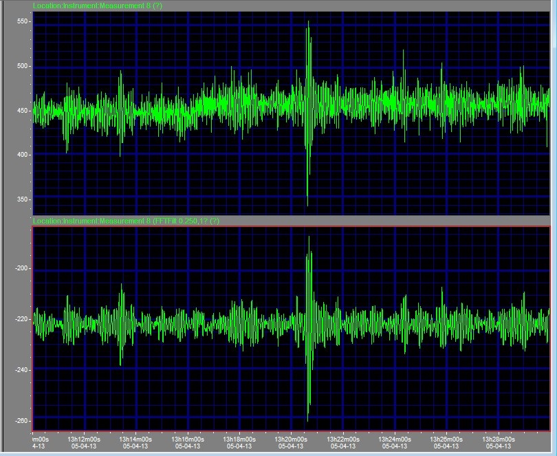 ma courbe pour le séisme de Russie. Les temps sont pour une fois pile poil. Mon dernier réglage de la période ~7 à 8 secondes semble être pas trop mauvais. De plus, j'ai l'onde P et l'onde S qui sont bien marquées.