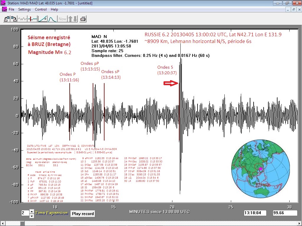 ma courbe pour le séisme de Russie. Les temps sont pour une fois pile poil. Mon dernier réglage de la période ~7 à 8 secondes semble être pas trop mauvais. De plus, j'ai l'onde P et l'onde S qui sont bien marquées.
