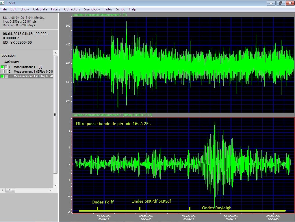 Courbe 3 et 4: relevé sur 01h45 de 04:45:00 à 06:30:00 et traité avec le logiciel TSOFT. La courbe du haut est brute sans filtrage. La courbe du bas est filtrée avec un passe bande de période 16s à 25s. Meilleur filtrage avec TSOFT que AmaSeis.