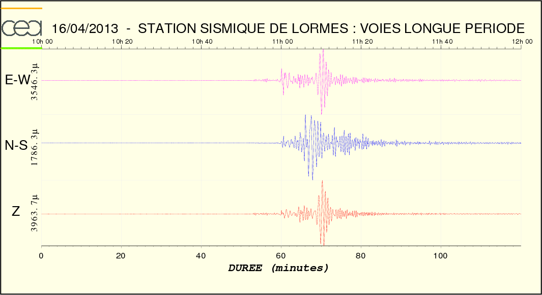 Le bruit de fond habituel enregistré par le CEA est aux environs de 0.5 micromètre. Petite remarque sur mon capteur: Il semblerait que les ondes P soit très bien passées et tendraient à montrer que mon capteur se comporte comme un capteur vertical (favorise les ondes P en général) mais les ondes S sont elles aussi bien passées donc favorisées par un capteur horizontal. En conclusion, je comme à croire que mon capteur est en réalité un capteur mixte!!! Quand pensez-vous?