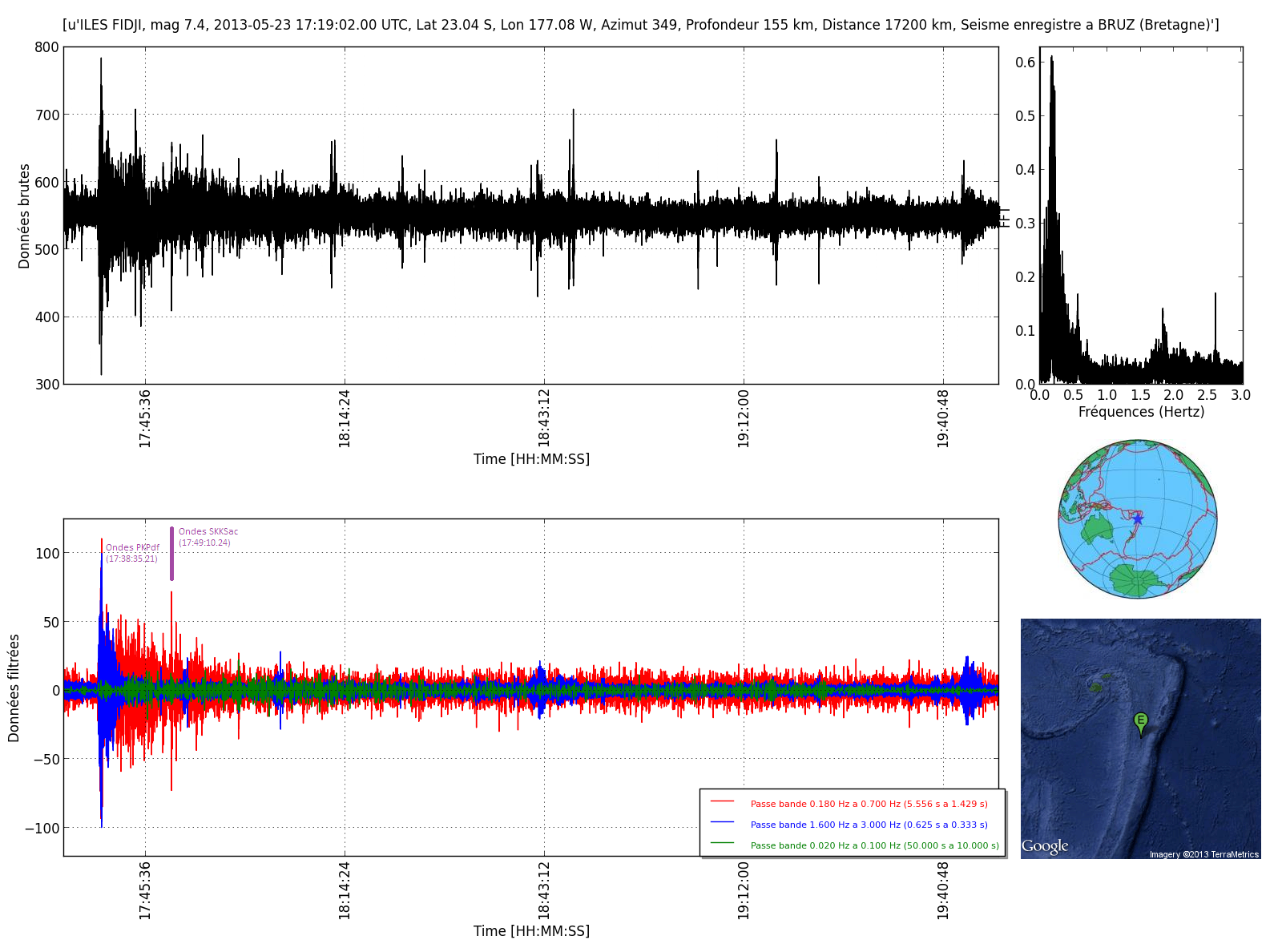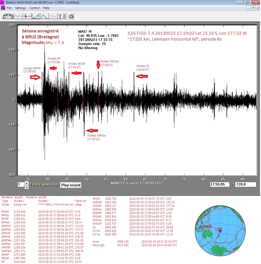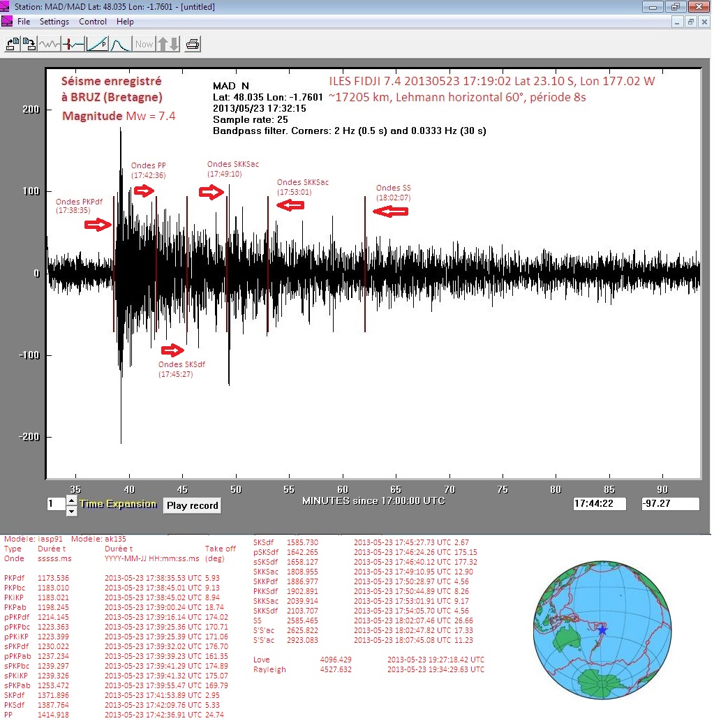 Coup de chance, j'étais devant mon écran quand l'onde PKPdf est arrivée chez moi. Donc j'ai suivi en direct l'arrivée de toutes les ondes. Merci au calculateur!!!